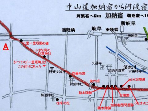 見落としたと判断していた加納一里塚は場所が移転しているよう、京都から来ると見えにくい位置にあるので見落とした可能性が大。 |