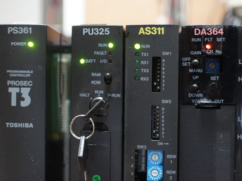 構成は、シャーシ+電源:PS351、CPU:PU325、Serial:AS311、AI:DA364、64P/DI:DI335H*4枚、DO:DO334というもの。 |
