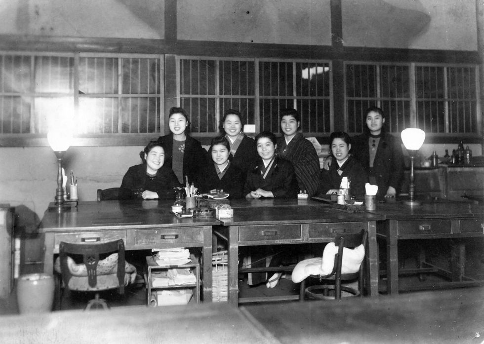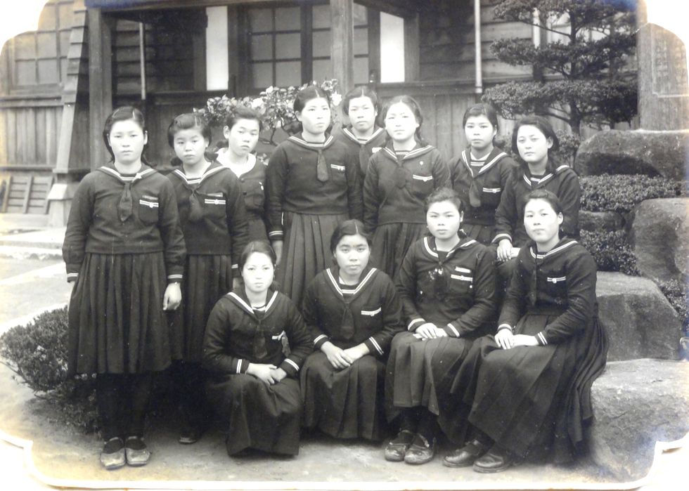 ![]() 母が通った田原本高等女学校の写真 ![]() 卒業時の記念写真(昭和17年) 田原本町は昭和前期まで中和地方(奈良平野の中央部)で大和川の水運を利用した物流の中心として賑わったが、物流の主体が 鉄道(国鉄や近鉄)やトラック輸送へ移ると徐々にその勢いを失っていった。古代から賑わい唐古遺跡や歴史ある寺・神社なども多い。 母は後列の右から二人目に写っている。比較的裕福な農家の長女だったので高等女学校まで行ったよう。 ![]() 南都銀行・田原本支店に勤めていた頃 卒業後は南都銀行へ勤めた。当時はそれなりの資産家の子女でないと入行できなかったそう。(後列の右から二人目) 叔父さん(長男)も同じ銀行に定年まで勤め、従弟(叔父さんの長男)も同じ銀行に勤務、役員手前までいった。 |
