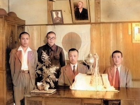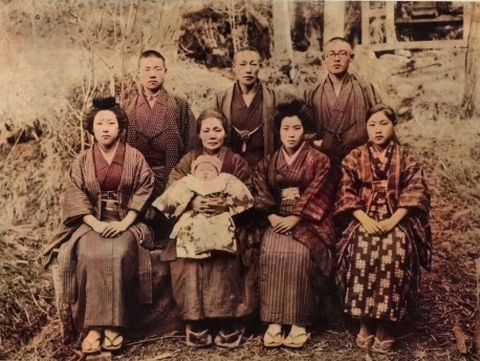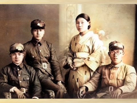 上は父が生まれた時(1920)のものと思われる、草履か下駄ばき、父は9人兄弟の末っ子なので長子はもう働いていたはず、兄弟のうち7人が写っている。祖母は1954年に亡くなった。 下は召集に応じた際の記念写真と思われる、他の人が誰かは不明。 |