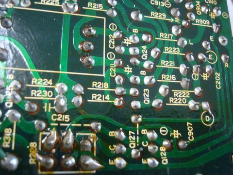まずは音が全く出なくなったので、レベル調整VRと出力周りの再ハンダを実施。これで音は切れずに出るようになったが。 |