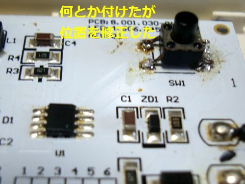 スイッチに触らなくても勝手に点いたり消えたりするので、操作スイッチ(1回路のタクトスイッチ)を手持ちジャンクのスイッチと交換。LED放熱の為にアルミ基板を使ってあるので半田付けが極めてしにくい。スイッチの背が高いので操作ボタンは取付不可。 |