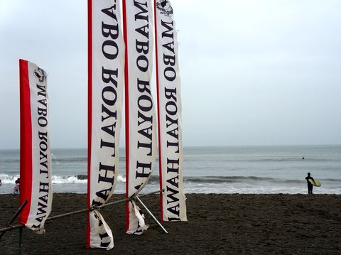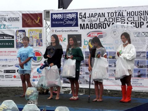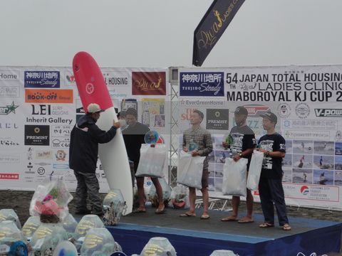 小雨の中で大会は行われたよう(観客以外は濡れても平気?)、午後4時からの表彰式を見に行った。通常のサーフィンの他にSUPなどもあり、年齢層別やボード長でクラスが細かく分かれていて表彰式は長い、副賞にボードや自転車もあり。 |