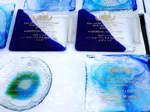 3つの会場に分けて競技を行うよう、表彰式用のガラスの皿などが多数展示されていた。 |