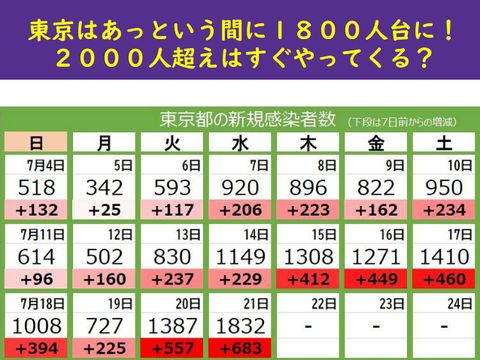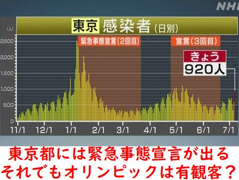 これまで2週間以上先週を上回る感染者数が続いたが遂に920人まで急拡大、直ぐに1000人、1500人にと拡大しそうな状況。これに慌てた政府は緊急事態宣言へと心変わり。「コロナに打ち負けた証の東京オリンピック」が確定か? |