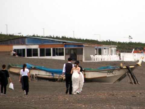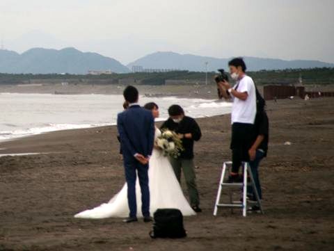 午後は雷の音が聞こえたが夕方は空も明るくなったので海岸へ散歩に。時々見かける結婚式の前撮り(今は式がないので前撮りとは言わないかも)を2組がやっていた。前撮りそのものは時々見かけるのだが2組もとは珍しい。 |