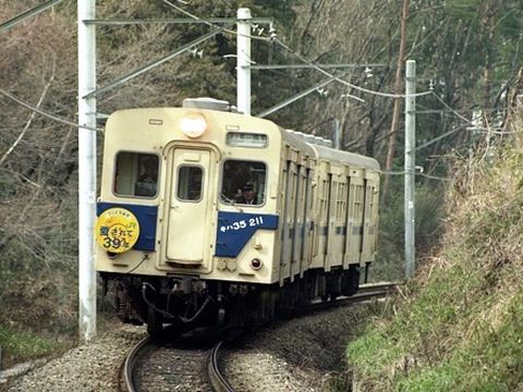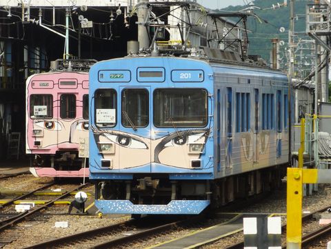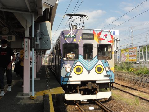 伊賀上野から伊賀鉄道へ乗り換えて3駅目の上野市駅(忍者駅)へ、たった7分だが260円と高価。車両は旧近鉄のものは消えて全て東急のステンレス車に置き換わった。 |