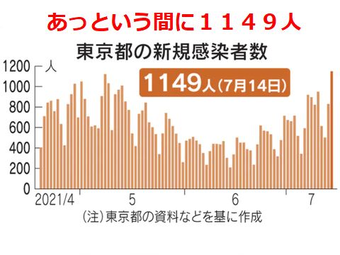 4度目の緊急事態宣言下でも感染者数はしばらく増え続ける、東京は5月以来の1100人超え。このまま感染者が増え続けたままインチキ五輪の開会式に突入か?組織委員会のバブル方式は穴だらけで約束のGPSでの追跡も殆ど出来ていないよう、口先だけの安心・安全の東京オリンピック。 |