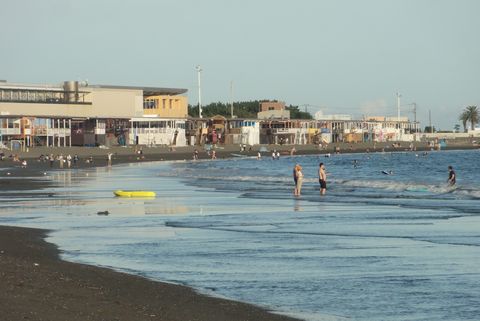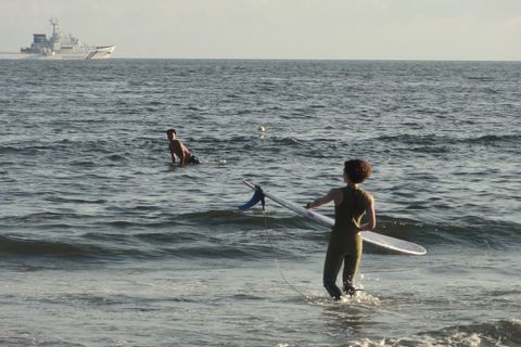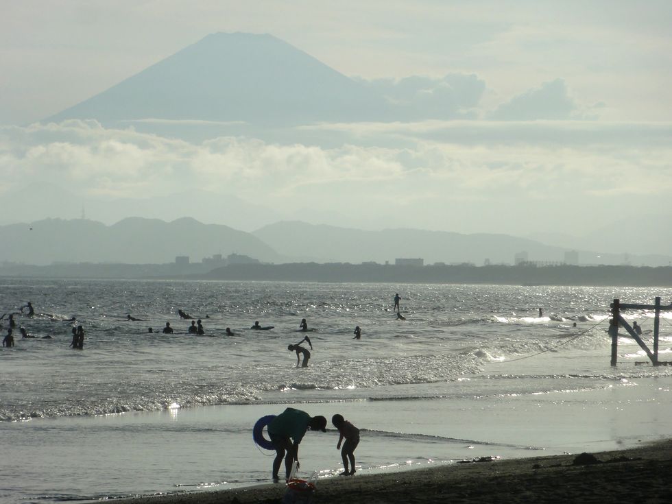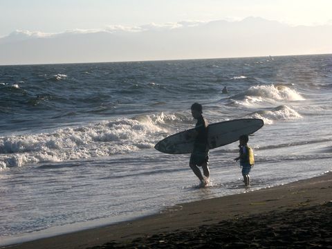 西浜の海岸はサーファーも多いが家族連れでの水遊びの客も多い。 |