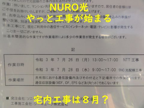 ADSLサービスは9月末終了、NUROの工事は大幅遅延?(申し込みしたのは5月下旬、工事は一カ月程度との説明だた)、NTT工事も必要で混雑で遅延?光ケーブル引き込みの宅内工事は8月? |