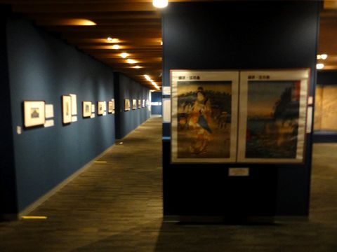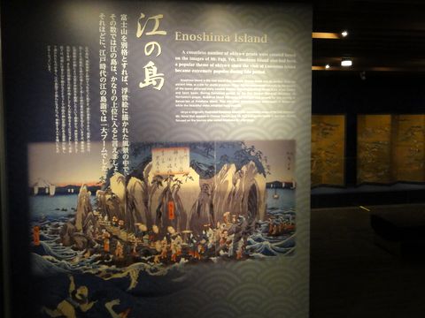 こちらは無料の恒久展示施設、テーマ展示は年6回の入れ替え。現在は「江の島」の浮世絵の特集展示。コロナ禍で他には誰もいない静かなスペース。 |