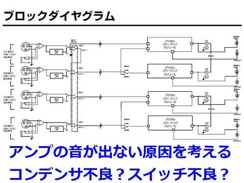 大分以前に入手した4CHデジタルアンプだが電源は正常に入るが音が出ない、入力処理部のコンデンサ劣化かモード切替(BTL切替と全CH同一)SWの不良だと思うのだが。 1CH分の電解コンを全数交換してみようかと検討中、ブロック図から全CHがおかしいというのは前段部分の不良しか思いつかないのだが。 |