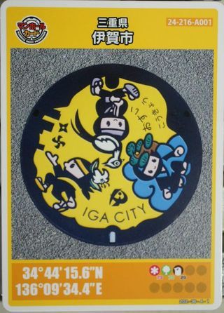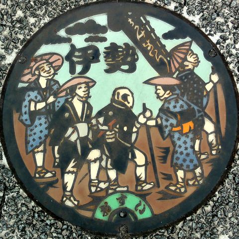 伊賀上野から亀山経由で二見浦へ、亀山からはキハ25系、内装は電車並みで空調も快適。駅から数分歩いて配布場所へ、夫婦岩までの距離を聞くと1.2kmあるとのこと、帰路の電車に間に合わないので断念。カラー版のマンホールも見つからず。御福餅の本店が赤福の店と並んでいた、今は車移動が主で駅からの夫婦岩への通りは閑散。 |