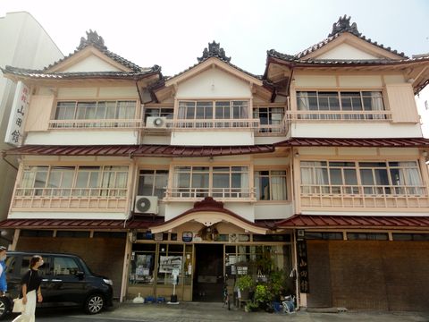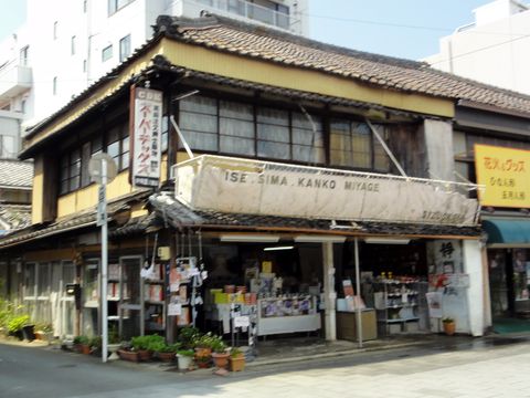 こちらは伊勢志摩の観光地の一部でにぎわう場所だがコロナと暑さで人は非常に少ない。 ずいぶん年季の入った3階木造の建物や刃物屋などもあり。 |