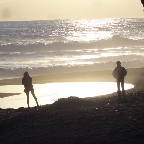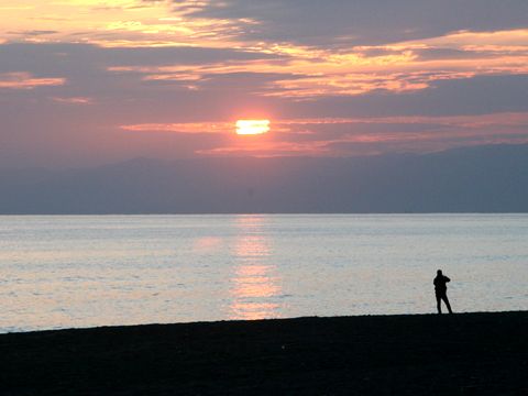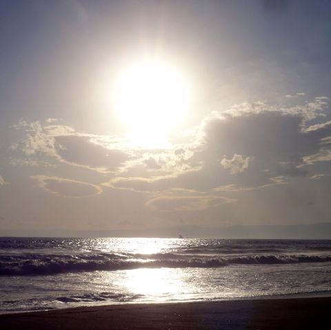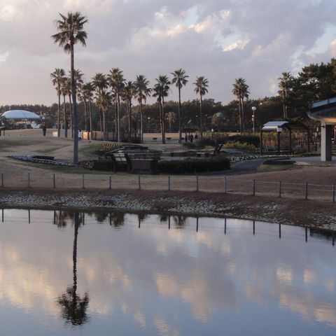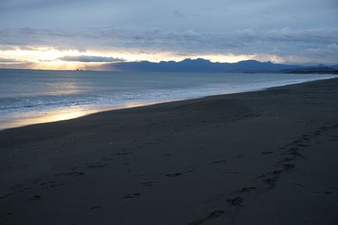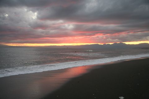 夕刻から雨模様ということで早めの散歩に。雲が低く垂れこめ富士山はまったく見えず。サーファーもいない。 |