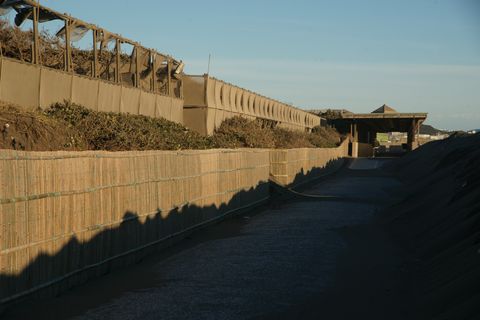 防砂用の柵が工事中、でも砂の重さに負けて壊れる所も。 壊れて作っての繰り返しで無限ループ? |