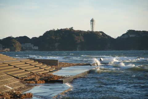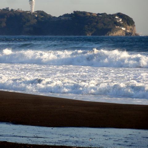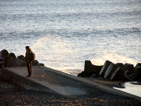 強風で人は少なめ。国道沿いの三笠会館はほぼ取り壊しが終わり残渣を整理中、またマンションが建つんだろう。海も大荒れでサーファー少なし。 |