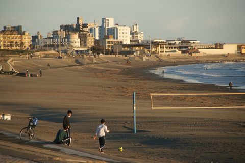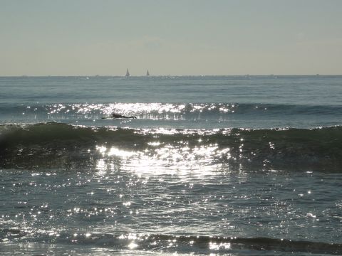 風もなく波もあってサーファーで大賑わい、砂浜ではちびっこのラグビー教室をやっていた、ちょっと前までサッカーが圧倒的人気だったが、近頃はラグビーも日本チームの活躍で人気に。 |