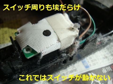 ヘッドのブラシが回らないため綿ゴミがブラシ周りに詰まってまともに吸い込めないという状態に。回転用スイッチがヘッド内部に入り込んだ綿ゴミが詰まって動作できないという状態が原因、設計がまずいのでは。スイッチ自身の故障も多い様。 |