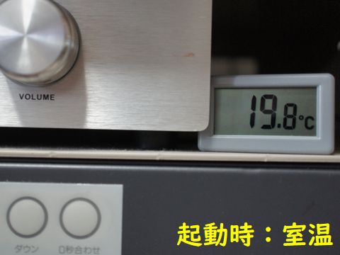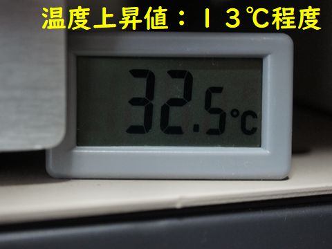 吸気側のファンを騒音対策で停止している(それでも後部のファン2個と側面ファンでうるさいが)のでケーズ内温度を監視すべく温度計を後面のスロットへ設置し機内温度を見ることに。 しばらく連続動作させて上昇値は13℃程度、冬はこのままで問題なさそう。 |
