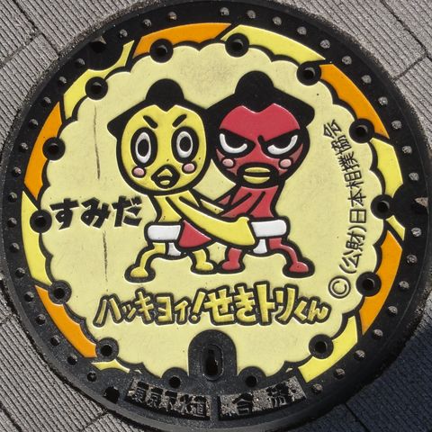 マンホールは駅近くの国技館の前の歩道にあり。両国駅は相撲一色、原寸大の土俵など。臨時ホームへの通路にはピアノも設置、誰かが弾いていた。 |