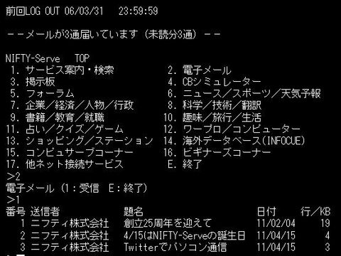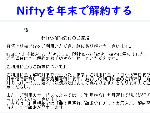 当初は富士通が米CompuServeと提携し始めたのでNifty-Serveという名前だったが提携解消で@NIFTYとなった。割にユーザに優しいサービスで契約者も多く掲示板サービスなどで盛り上がった。その内に親会社の富士通の経営悪化でノジマへ事業売却されてしまった。 この後はノジマの「悪徳」経営でサービスレベルの悪化がどんどん進んだ。光化の機会でNURO光に乗り換えたので年内で契約解約とする。プロバイダが変わるのであちこちの登録サイトの変更が結構大変だったがほぼ完了。 |