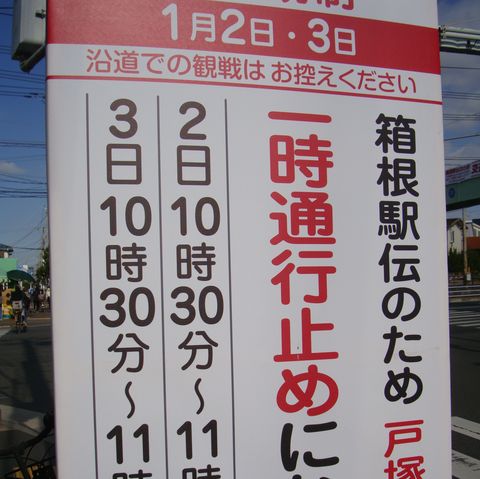 近所の交差点には新春の箱根駅伝の通行止めの案内看板が設置された。3区と8区なので通る時間はほぼ同じ10時半過ぎ。 |