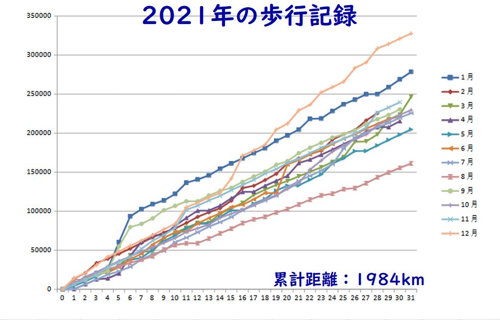 ![]() 今年の歩行記録:ほぼ2000kmだった コロナ禍で遠くへの旅行は控えたこともあり距離は伸びず、特に雨の6月は低調。12月は外出回数も多く距離が伸びたのだが。 |