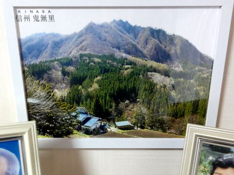 鬼無里の写真、フレームに入れて飾ったダイソーにA4サイズのフレームがあったので購入して入れてみた、六切りノビというサイズで横方向がやや足らないがほぼピッタリ。仏壇の上に掛けておくことに。これは2017年5月2日に父の生家のすぐ近くから見た風景。 |