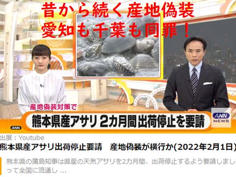 またまた「あさりの産地偽装」が発覚アサリが殆ど取れないのに「熊本県産」アサリの出荷量は全国一という大矛盾にこれまで眼を瞑ってきた農水省がやっと検査、これまでも愛知県や千葉県で同様のごまかしが摘発されてきたのに、熊本県はもっとも程度が酷い偽装。海面を貸していた漁協も同罪だろう。 |