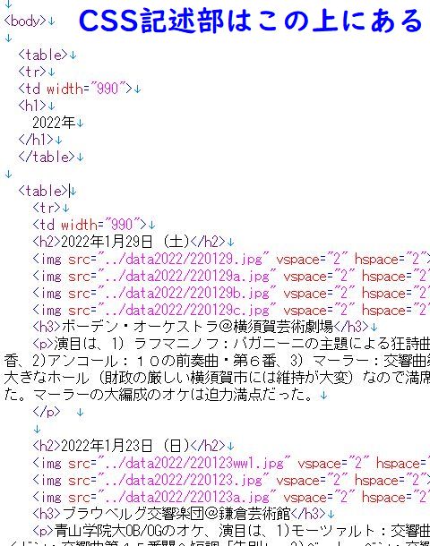 CSSを利用した新しい?HTMLでの記述色やフォント種類、サイズ、配置など表示に関する「装飾」部分はstyle部に記述するので、本体はコンテンツが主体となって見易い。 |
