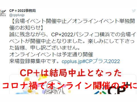 コロナ禍でCP+は中止に陰性証明書の提示など厳格な入場条件を設定していた(普通の人には入場が非常に困難)が遂に「開催中止」となった。 オンライン開催は実施とのことだが盛り上がりは期待薄、新製品発表の場も無くなりビジネスにも暗雲? |