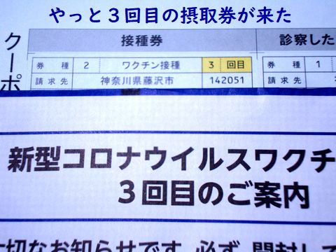 ワクチン接種3回目の接種券うちの奥さんの3回目接種券がようやく届いた、さっそくかかりつけ医に予約するも3週間先だとか。2回目が7月中旬接種なのでちょうど7か月目になる、6か月への前倒しはもう実質的に無理そう。 |