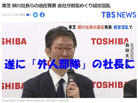 迷走する東芝はどこへ3つの事業会社へ分割すると発表したが不評で2つに変更し原子力や社会インフラは本体に残すと方針転換するも不評は続き、トップが辞任する事態に。 今度は車谷が連れてきた「外人部隊」の社長が誕生。東芝エレベータと東芝キャリアは売却するとの方針も公表すみ、だから東芝エレベータは文句を言わせない為に原子力出身の社長に換えたのかと邪推。 売れる事業は皆売ってしまい残るのはカス(マルドメの電力・原子力に市場縮小の公共事業など)ばかりに、東芝に何の愛着もない?新社長で破滅へ一直線? |