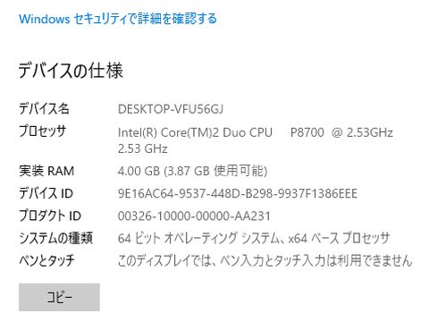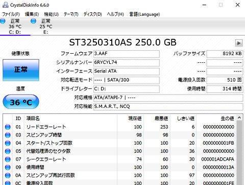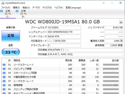 動作は遅いが非常用WindowsUpdateを実施後、CPU温度とHDDの状態を確認。 HDDは古い80GB-SATAを2台内蔵、まだまだ寿命時間には到達しないと思われる。 |
