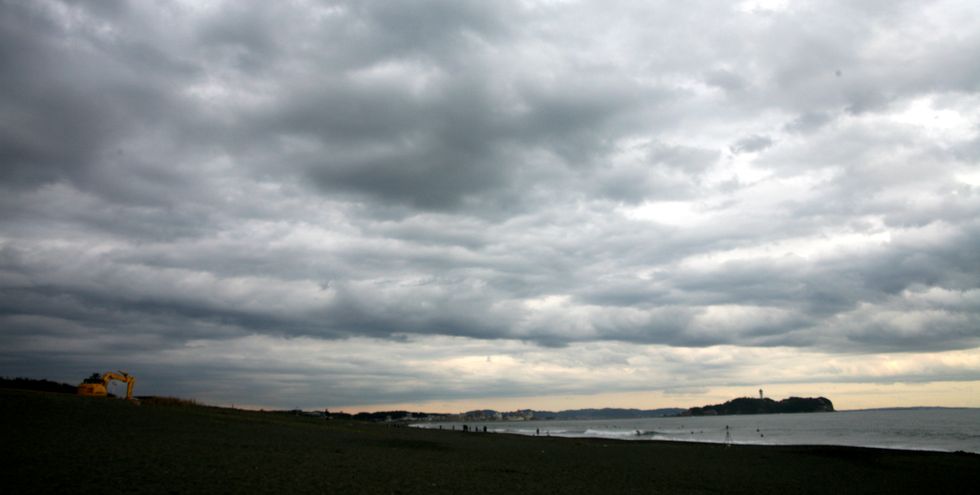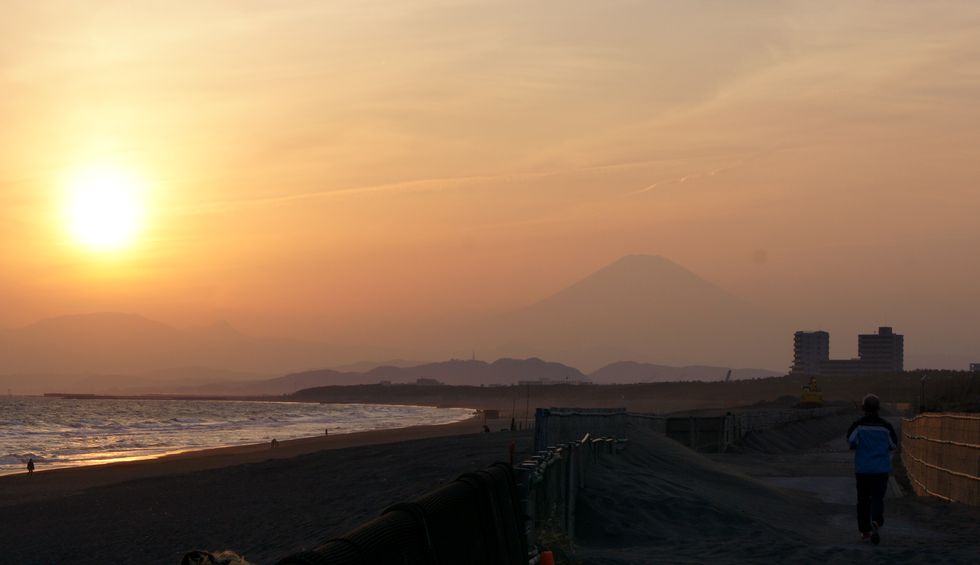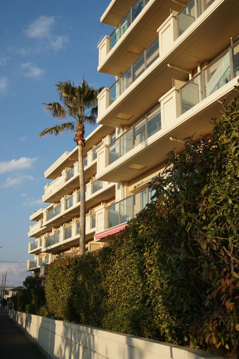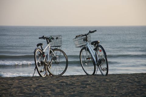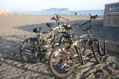 海岸の自転車近隣のサーファーは自転車に専用金具でボードを積んで海へやってくる。コンビニにあるレンタル自転車で海岸の遊歩道を走っている人も結構見かける。 |