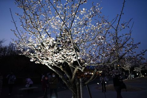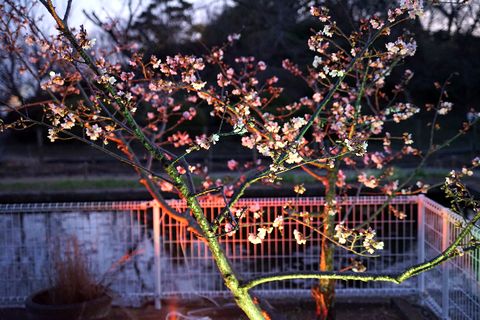 玉縄桜のライトアップへ大船フラワーセンターで桜のライトアップ、通常5時までだが7時半まで開園し桜を中心にライトアップ。風が強かったが寒さに震えることはない。 暗くなる6時前から人が次々入ってきて結構な賑わいに。レストハウス周辺の木もライトアップで綺麗。 |