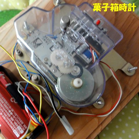 菓子折り時計?分解して保管の電池時計、電池を繋ぐと動くので菓子折りに入れてみた、時報機能もあったがハンマーは撤去したので鳴らない。 クォーツではなくただのテンプを使った電池時計なので進み遅れの調整が大変。 |