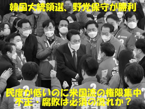 懲りない国「韓国」昨日の韓国大統領選、深夜に決着したが僅差で野党側の勝利と言う結果に。バラマキとしか思えない公約の乱発でこれから先はまた同じ混乱の繰り返しとなる? 現大統領の辞めたあとは訴追と刑務所行きが待っているのかも、民度が低い国なのにアメリカの猿真似制度で権力集中の大統領制度なので汚職やインチキが横行する国。 |