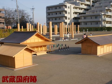 府中本町駅前には国府跡さらに進むと府中街道と交差する、角には高札場跡。この先右手が大國魂神社、左方向へは名物のケヤキ並木が続く。大國魂神社を通り抜けて府中本町駅へ。 駅前には、武蔵国府跡の遺跡が整備されていた。駅の中はエスカレータができた程度で大きな変化はない。 |