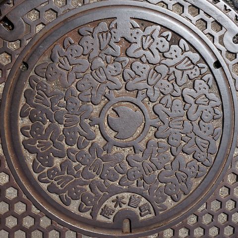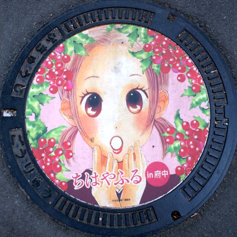 府中市「ちはやふる」下河原線跡地の緑道にあった3つのマンホール。 |