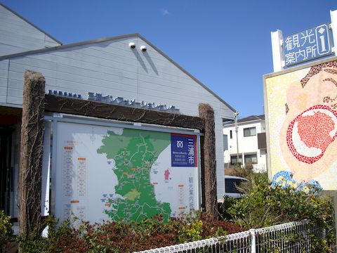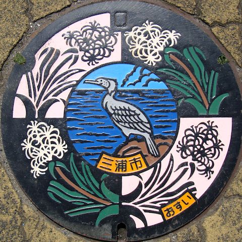 三浦市のマンホールカード三浦海岸駅から海へ向かって5分、海辺の道路沿いにある観光案内所で入手、マンホールはすぐ隣の駐車場前にあった。 |