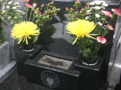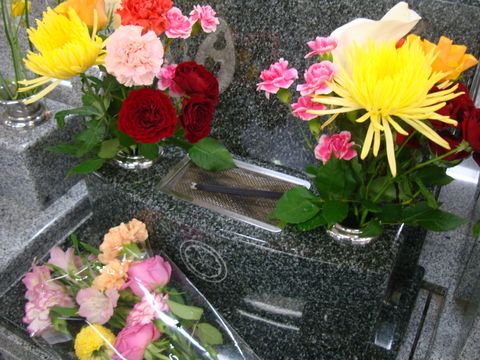 寒さで花は半数が残っていた持参した花(7種各2)を入れて、残っていた花は階下の墓へ入れてきた。 |