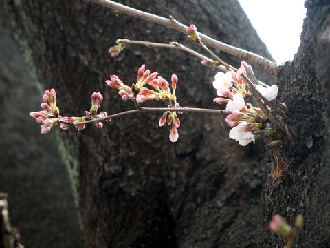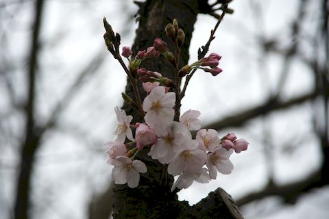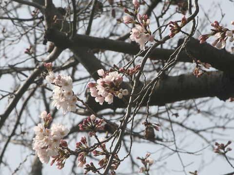 駅前の公園で桜が開花駅そばの小さな公園だが古く大きな桜の木が何本かあり、来週中頃には満開になると思われる。 現状はまだ1−2部咲きというところか。 |