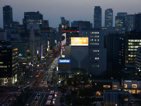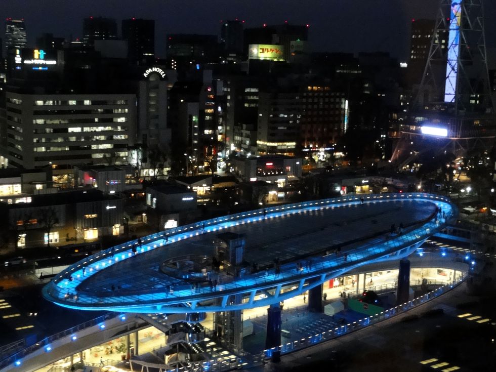 愛知芸術センター、11階の展望回廊から撮影中津川からの帰路、千種で地下鉄に乗り換えて栄で下車、直ぐ近くの愛知芸術センター(大ホールがある)の11階にある展望回廊へ行く。 夕暮れから薄暗くなるまで30分程撮影、他には2−3人しかおらず静かなもの。 |