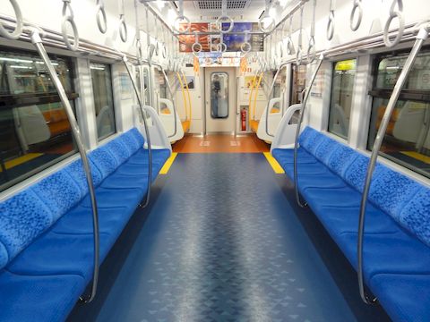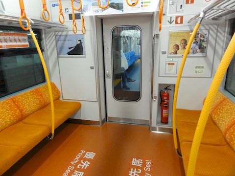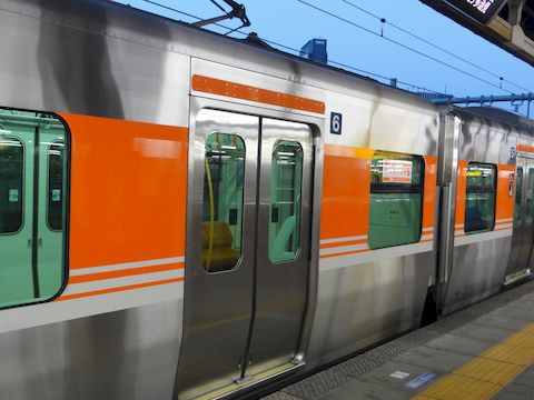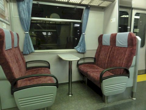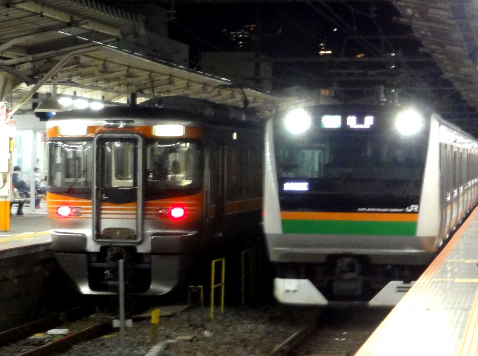 JR東海の313系8000番台が静岡に中央線のセントラルライナー用に製造された8000番台、座席は特急車両の373系によく似た構成で車両端部には4人掛けのテーブル付きボックス。 またドア横には透明な仕切り板を配置して座席に座った人との干渉を防いでいる。 この車両が熱海駅に来て、E233系と並ぶ風景が見られるとは予想外(E233系が貧相に見える?)。 |
