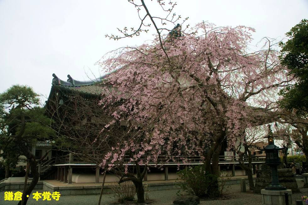 本覚寺の枝垂れ桜大仏から歩いて鎌倉駅前へ、小町の本覚寺の本堂横の枝垂れ桜は満開、このお寺は身延山の日蓮宗本山の別院格。 |