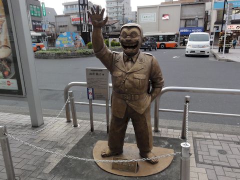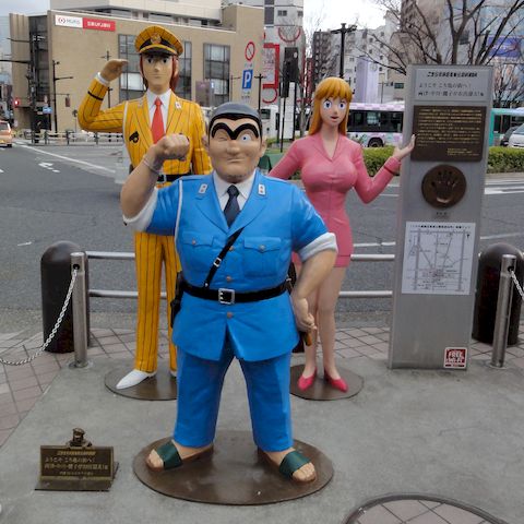 こち亀のモニュメント2つ駅出口のすぐ前にモニュメントが2つもある、マンホールは駅前すぐにはない。 |