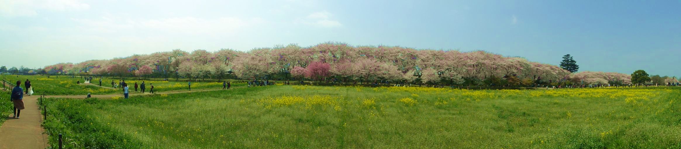 パノラマ画面堤防に連なる多数の満開の桜がカメラの画面に入りきらないのでパノラマ撮影してみた。 |