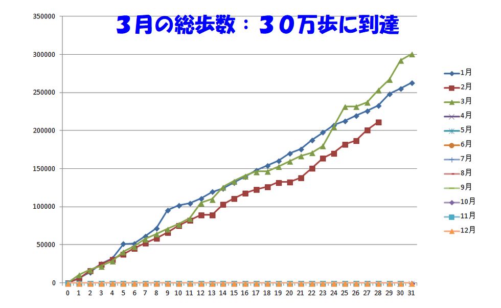 3月は30万歩越え今月は2日間の中山道歩き(中津川から南木曽)と名古屋市内散策、権現堂堤の桜とマンホールカード集めで歩数が伸びた。 |